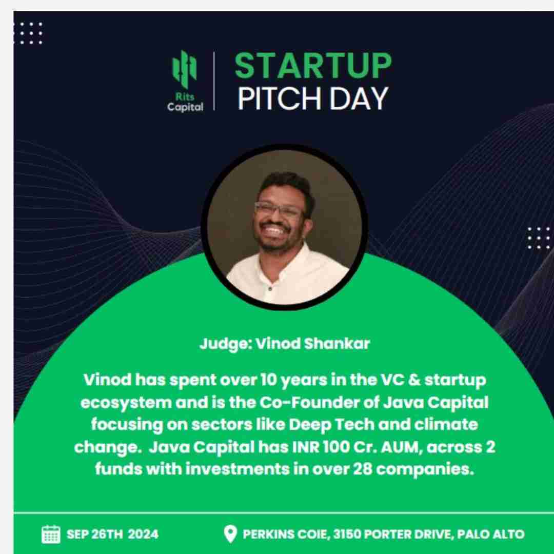 Vinod spoke of Java Capital & DeepTech innovation in India to the ATEA participants in the Bay Area. | | Vinod participated as a judge at the Rits Capital Startup Pitch Day in Palo Alto. | | | |